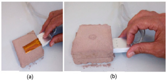 Type K thermocouples were introduced into the well to the following depths: 0, 1, 2, 3, 4, 5, 6, 7, 8, 9, and 10 m (see Figure 6), to determine the thermal inertia of the subsoil in Phase 2. The thermocouples were connected to dataloggers on the surface. Through these thermocouples, the maximum and minimum temperatures were obtained from 11 August to 13 October 2019; later, the average temperatures were calculated. The subsoil temperatures are compared with the air temperature registered by the ITSON Climatological Station, located a few meters from the site. To measure the thermal diffusivity (a), thermal conductivity (λ), and heat capacity (Cp) of the soil, altered samples recovered were compacted to have a density close to that of the undisturbed soil (see Figure 7a,b). The thermal conductivity was measured by means of the THB 100 equipment from the Linseis company [13]. This equipment uses the Transient Hot Bridge (THB) method to measure the heat transport properties of materials and combines the Hot Wire, DIN EN 993-14 [14], and Transient Hot Strip methods, DIN EN 993-15 [15]. A THB6N type sensor is placed inside the sample, which includes a metallic conductor in the form of a band set in tandem. The band emits a constant flow of heat during measurement. This causes a rise in temperature. Knowing the increase in temperature as a function of time, it is possible to calculate the thermal properties of the material sample [16]. Before testing, the sensor was calibrated with Polymethylmethacrylate (PMMA) samples provided by the manufacturer.