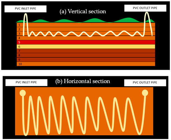 Schematic design for heat exchanger: (a) depth installation (vertical section) (b) pipe design (horizontal section).