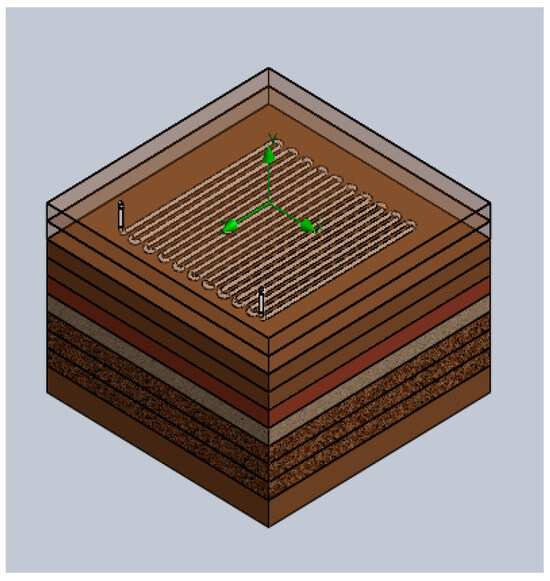 With the physical limitations stated previously, the reference values that can be assumed to represent the behavior of the buried heat exchanger will be analyzed with “Flow Simulation of SolidWorks” to improve the design and place it in the best layer to obtain the best temperature gradient and the lowest excavation cost.
