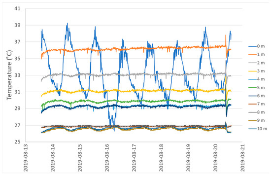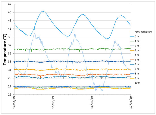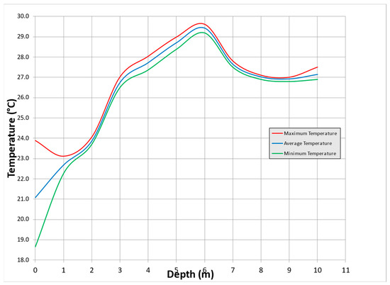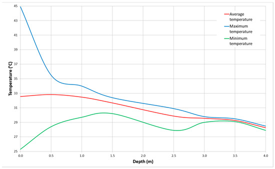 Figure 13 was prepared with all the data acquired from 25 August to 6 October 2018, at the hottest hour of the day (2:30 p.m.). The average as well as the maximum and minimum daytime temperatures at the indicated time were determined for each depth and plotted. The figure shows the variation with depth in the maximum (red curve), minimum (green curve), and average temperatures (light blue curve). This graph is a support element used to determine at what depth the soil temperature is adequate to assist in the air-conditioning of the building. Deeper into the ground, the separation between the maximum and minimum temperature curves is reduced. In the first meter of depth, maximum temperatures decrease rapidly, related to the predominant soil type (silty sand) and radiation. From 1 to 3 m, temperatures are still above the average air temperature (30 °C), although the soil is clay. It is from 3 m down that the soil temperature is below the air temperature, and adequate thermal conditions are found to use heat exchangers to improve the thermal comfort of the architectural space [18,19,20,21] (soil type: low-compressibility clay, with 12.4% humidity).