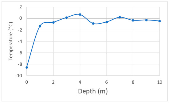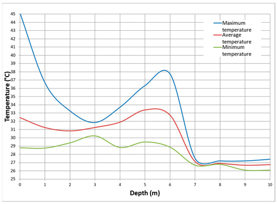 The average as well as the maximum and minimum daily temperature values measured in the soil at 3:40 p.m. every day from 11 August to 13 October were determined for each depth and plotted. The variation with depth in the maximum, minimum, and average temperatures is shown. In Figure 14, around 3 m deep, there is a spot where the temperatures in the well are closer to those of thermal comfort. Between 4 and 7 m, there is an increase in temperatures, probably because the soil is sandy in this range. From 7 m onwards, the soil is again mainly clay, and a significant reduction in temperatures and a more considerable difference between the maximum and minimum temperatures is observed. If we only consider the thermal inertia of the soil, the latter is the most suitable depth to install heat exchange wells for the application considered [18,19,20,21]. If we also consider installation economy factors, a depth of 3 m is more suitable.