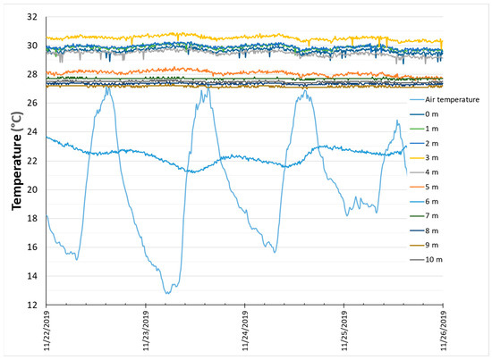 Figure 16 and Figure 17 show the typical evolution over time of the ambient temperature (air) and the soil temperature from 0 m to 10 m, during August and November, respectively. The behavior is analogous to that reported by other researchers [22,23]. There is a sinusoidal thermal wave, whose amplitude decreases as it goes deeper into the subsoil. However, from a depth of 1 m, the temperature variation is small (1 to 2 °C) compared to the air temperature variation (10 to 15 °C). This fact is important when choosing the depth that the wells of the ground–air heat exchanger system will reach, since it can increase the efficiency of the system.
