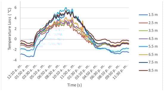 Figure 22 illustrates the outcomes of a simulation performed using SolidWorks to analyze a heat exchanger system with varying depths (1.5, 2.5, 3.5, 4.5, 6.5, 7.5, 8.5 m). These depth values were specifically chosen to minimize the influence of the outermost layers of materials. The graph presents the temperature differential between the heat exchanger’s inlet and outlet, essentially representing the heat dissipation of the fluid. The greater heat loss observed is indicative of the fluid’s capacity to exchange heat with the surrounding environment, considering both the properties of the exchanger and the ground.