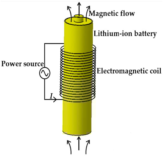 The induction heating technology was developed based on Faraday’s law of electromagnetic induction with the advantages of no pollution generation, fast heat production, and high heating efficiency. When the wires are subjected to an AC, an alternating magnetic field is generated around the copper coil, giving rise to a variation in the magnetic flow inside the LiB in the magnetic field. Due to the electromagnetic induction phenomenon, the LiB in the closed loop cuts the magnetic induction line to produce an induced electromotive force, which can drive the free electrons to generate directional motion that creates an induction current and converts electrical energy into Joule heat through the resistance effect of a conductor in order to make the LiB’s temperature rise.