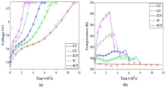 The model validation under the charging tests with different rates at 298.15 K. Solid line = model results, circles = test results. (a) Voltage response; (b) temperature response.