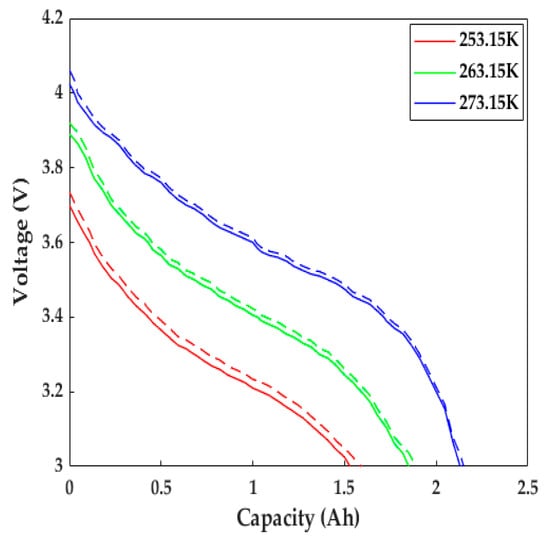 The LiB performance in cold weather can be explored using the proposed ETCM. The constant current discharging data with a 1C rate at different low temperatures from [23] and its corresponding numerical results are presented in Figure 6. Due to the slow Li+ diffusion, low-electrolyte electrical conductivity, and other reasons, the increase in LiB impedance led to the expansion of the partial voltage of the internal resistance; thus, the LiB voltage declined rapidly as the temperature decreased, causing a decrease in the time to reach the cutoff voltage, with the degree presenting an uptrend with the decrease in temperature. The capacity at 253.15 K decreased by nearly 40% compared with the rated capacity (only 1.53 Ah). We can see that the simulated voltage profiles agreed well with the experimental data: the computational capacities were 0.06, 0.04, and 0.015 Ah more than the test ones at 253.15, 263.15, and 273.15 K, respectively, which mainly resulted from the inadequate consideration for the effects of SEI film growth and lithium plating/stripping, since the SEI film growth rate was defined as a constant, and the contact resistance between the electrode material and tab/collector, poor conductive agent, and adhesive with the aging of the LiB were not taken into account in the study.