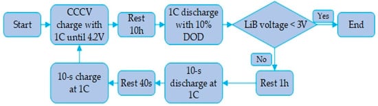 To determine the extent to which the ultrafast electromagnetic induction heating system improves the LiB’s poor performance in cold weather, the fully charged LiB was discharged to 3.0 V with a constant current at a 1C rate during the heating process, and the discharge time/capacity was measured to evaluate the enhancement of energy release. After the heating, the LiB with 100% SOC was analyzed using the HPPC test simulation (see Figure 9 for procedure) to obtain the charge and discharge pulse power and internal resistance, which can reflect the LiB’s dynamic pulse characteristics at different intervals of SOC through the discharge and feedback pulse. We compared the distribution and amount of the cyclable lithium inside the active particle at the half length of the negative electrode after the constant current discharge at 243.15 K until the terminal voltage decreased to 3.0 V and after the end of heating the LiB. The Li+ concentration inside the particle can be seen in the form of cloud charts to study the recovery of the work potential and the influence of the heating method on the interior of the LiB. Finally, the rapid heating from 243.15 to 293.15 K was repeated 60 times, and the LiB discharge capacity at a 1C rate was calibrated every 5 heating cycles. Starting with 100% SOC, we can observe the degradation of the cycle capacity to verify the impact of the heating method on the LiB durability compared to normal charge–discharge cycle capacity at room temperature.
