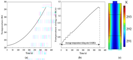 As stated above, the uneven temperature distribution could be due to the low thermal conductivity of the LiB materials, so we explored the impact of the radial thermal conductivity of the active material on the LiB temperature gradient. As can be seen from Figure 16, the maximum temperature differences inside the LiB after the heating were 5.1 and 7.13 K at 0.8 W·m−1·K−1 and 0.7 W·m−1·K−1, respectively. For the low radial thermal conductivity, the inadequate heat transfer can bring about a large temperature gradient from the battery shell to the mandrel, and this heterogeneous temperature distribution inside the LiB is expected to cause the degradation of LiB material, hence accelerating the LiB aging and irreversibly reducing the LiB’s cycle lifetime. For the high thermal conductivity, the opposite results were observed. Thus, to avoid affecting the work capacity of the LiB, using a better battery material with a sufficiently high thermal conductivity is an effective way to improve the LiB temperature consistency during the heating process.