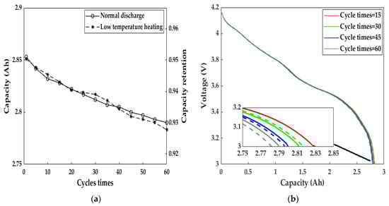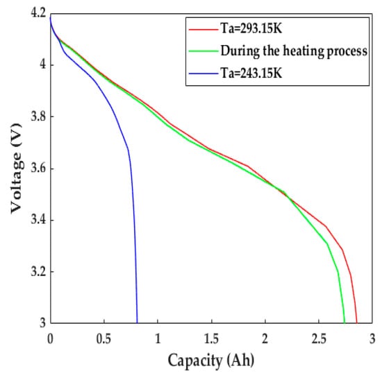 In the context of the global energy crisis and environmental pollution, new energy vehicles, especially zero-emission and pollution-free EVs, are gradually replacing traditional internal combustion-energy vehicles and will become a mainstream means of transportation [1,2]. At present, LiBs have been widely applied in EVs as the major power source due to their advantages of high energy density, low self-discharge, no memory effect, etc. [3]. However, the performance of LiBs faces serious degradation at low temperatures (subzero Celsius), and the significantly increased internal resistance of LiBs leads to a substantial loss of pulse power and usable energy for the slow intercalation and de-intercalation of Li+, low-electrolyte electrical conductivity and Li+ diffusivity in the negative electrode, and large solid-electrolyte interface (SEI) film impedance, which cause a reduction in the cruise range and restricts the applicability of EVs in severely cold regions [4,5,6,7]. On the other hand, it is difficult for LiBs to be charged and discharged at low temperatures, and if charging is forcibly performed, lithium is likely to be deposited in the form of lithium dendrites on the surface of the negative electrodes, which may result in an internal short circuit, causing the thermal runaway and irreversible energy decline in the LiBs [8,9]. Therefore, on the premise of ensuring safety, rapid heating of LiBs up to a charging/discharging-friendly temperature is a longstanding goal of battery management systems (BMSs) in order to improve LiBs′ poor performance in cold weather.