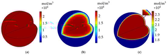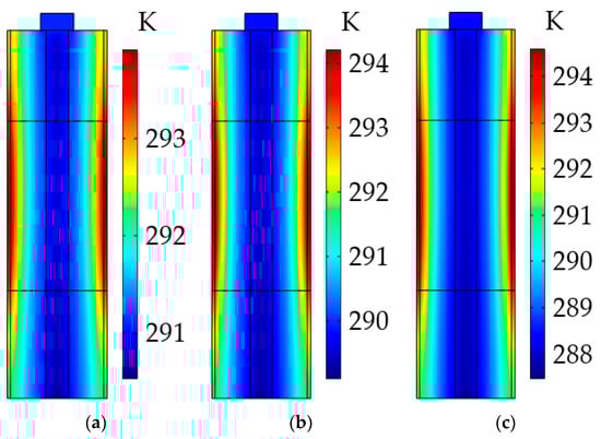 Temperature distribution inside the LiB at different radial thermal conductivities of active material after the heating. (a) At 0.9 W·m−1·K−1; (b) at 0.8 W·m−1·K−1; (c) at 0.7 W·m−1·K−1.