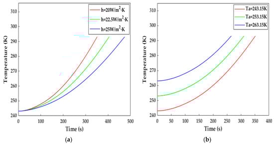 The impact of external environmental factors on the increase in temperature. (a) With different surface heat transfer coefficients; (b) at different ambient temperatures.