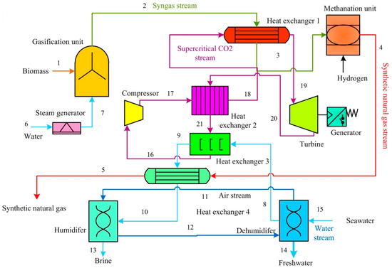 | Ji-chao et al. [61] | 2021 | Gasification | Recuperation S-CO2 Brayton cycle combined with Kalina cycles | 7400 | 78.15% |