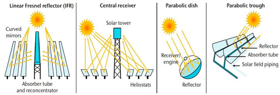 | Typical technology | Parabolic trough collector Solar power tower Linear Fresnel reflector | Parabolic trough collector Solar power tower Linear Fresnel reflector Power dish collector | Particles Gas |