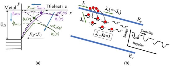 Electrons confined within localized states also possess the capability to transfer and migrate into the conduction band of insulators. This occurrence can be attributed to an internal Schottky effect (Equation (12)), where the potential barrier height due to the Coulombic force generated by positively charged ionic centers is reduced by high electric fields. Importantly, the Coulombic force in the Poole–Frenkel effect (Equation (13)) stems from a stationary positive charge, whereas in the Schottky effect, it results from a movable image charge. Consequently, the potential barrier reduction in the Poole–Frenkel effect is twice as substantial as what is observed in the Schottky effect [