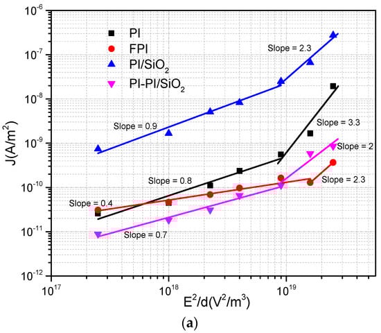 2 samples. However, when examining the second slope in the J–E curves for PI, FPI, PI/SiO