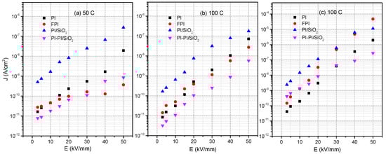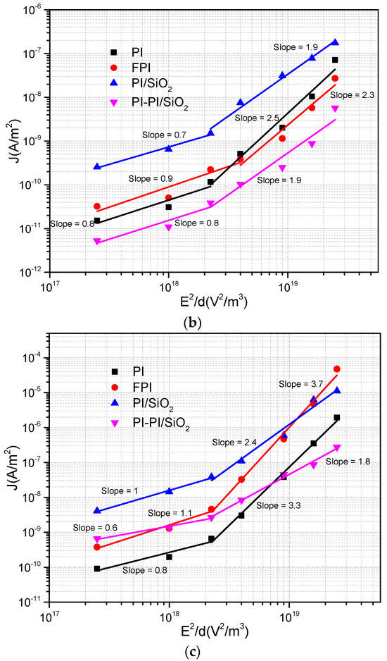 Table 3. For instance, in the case of FPI films at 160 °C, both space-charge-limited current (SCLC) and hopping conduction appear to coexist. SCLC is associated with the mobility of both holes and electrons, while hopping conduction involves ions at donor and acceptor sites within the bulk. These ions require either thermal or electrical energy to participate in conduction by making room for neighboring electrons or holes, depending on their respective trap energy levels. It is important to note that our estimation of these conduction phenomena is based on the analysis of current density slopes over specific electric field ranges, rather than at individual points. Therefore, it is challenging to precisely pinpoint the exact electric field in which these conduction mechanisms occur. Exploring conduction mechanisms in polymeric materials, particularly in the case of composite materials, presents a complex challenge. This complexity becomes even more pronounced in the context of this study. Our findings underscore that the dominant conduction mechanisms are significantly influenced by both the electric field strength and the measurement temperature, regardless of the specific material under examination. However, within the scope of this study involving polyimide-based materials, it is evident that two bulk conduction mechanisms, namely Poole–Frenkel and hopping, emerge as primary contributors, particularly at elevated temperatures of 110 °C and 160 °C.