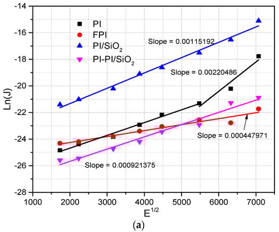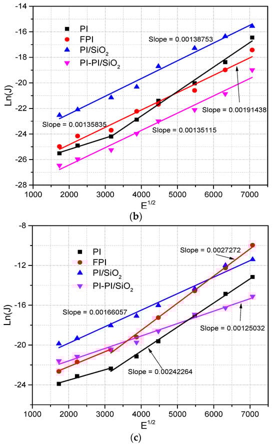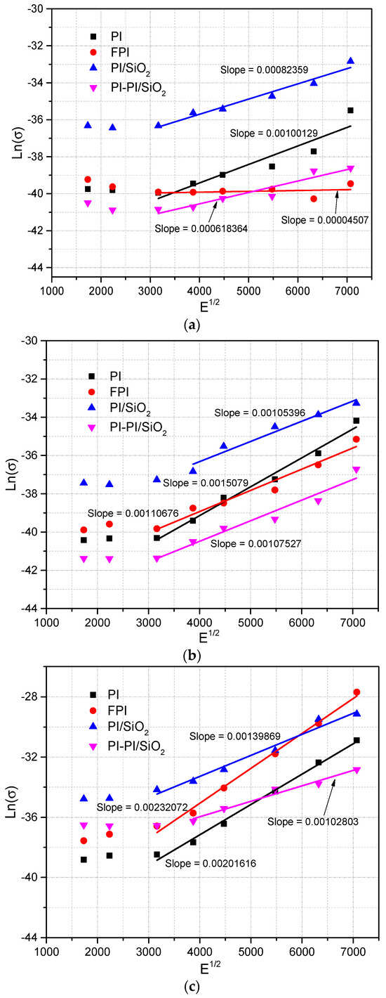 Figure 11, PI and FPI films exhibit the best data matching across the entire electric field range, confirming the occurrence of hopping conduction in these materials.