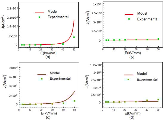 Figure 1b represents the SCLC model and bulk current. In the SCLC model, a fundamental condition is that the electrode must establish an ohmic contact with the insulator to guarantee adequate space charge in the dielectric [