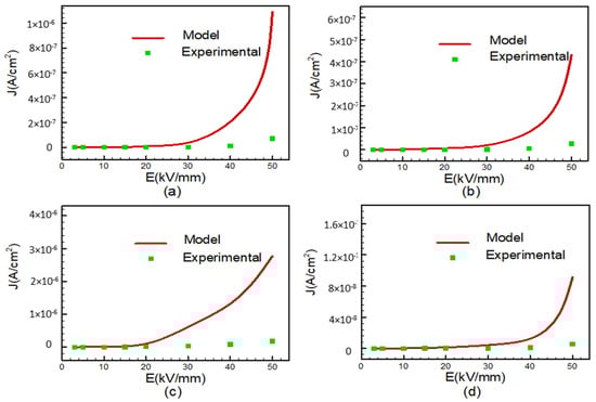 31]. In the steady state, the current density through each electrode and the bulk material must be constant, i.e., it must have the same value at every place. It is therefore not a situation where the current is either injected (i.e., the Schottky process) or carried by bulk transport, but one in which one of the processes acts as the controller of the others. For example, where injection at a given electrode field is higher than bulk transport, space charge builds up to limit the injection to what can be carried by bulk transport; this is the controlling process. The injection of charge at a lower electric field is almost very low, and the current density J, which follows the Ohm law, can be computed from the following expression, as shown in Equation (1):