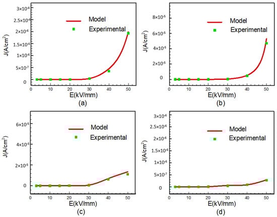 32]. However, due to the reduced and thinner injection barrier under a high electric field, a substantial amount of charge can be injected via Schottky emission. Consequently, even if the electrode and insulator lack ohmic contact, the significant injected charge and trapping process cause the conduction behavior of the dielectric to align with the SCLC model. According to the illustration in