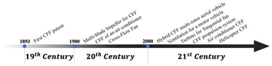 To date, a substantial number of fan-based patents have been registered, and a closer examination, including a concise overview of the most significant patents depicted in Figure 2, reveals the expanding applications of Cross-Flow Fans (CFFs) across various industries. CFFs are particularly noteworthy for their quiet operation, rendering them an ideal choice for domestic purposes and for incorporation into air conditioning systems, as noted in the study by Kim et al. [2]. The unique characteristics of the CFF’s impeller, coupled with its high external-to-internal diameter ratio, render it exceptionally well suited for implementation in combine harvesters, as highlighted in the research conducted by Gebrehiwot and Ölvander [3]. This points to yet another promising application of CFFs, underscoring their versatility in various domains. Furthermore, it is worth noting that CFFs have attracted attention in the context of commercial aircraft, as demonstrated by research conducted a few years ago. This suggests their potential for improving the efficiency and performance of air circulation systems within such aircraft [4,5,6,7].