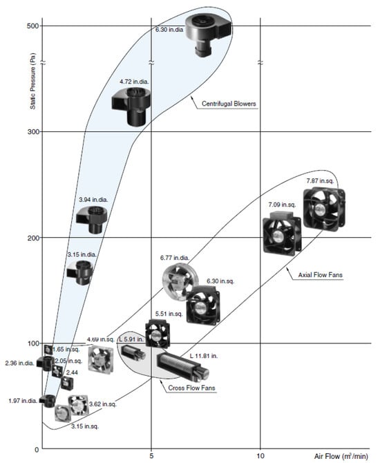 Comparison of fan characteristics (adapted from (https://www.orientalmotor.com/downloads/catalog-archive.html, accessed on 1 September 2023).