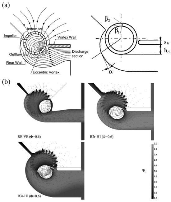 Another study has centered on establishing the correlation between design parameters and the performance of Cross-Flow Fans (CFFs) [43]. The most critical parameters influencing the fan’s performance are depicted in Figure 4a, while contour plots illustrating the entire pressure fields are presented in Figure 4b. The researchers identified a relationship between these design parameters, the flow-field pattern, and fan performance. The study’s focus was primarily directed towards investigating the connection between the rear wall and the flow field, with specific attention given to the radial width of the rear wall. Nonetheless, the position and thickness of the vortex wall were also examined to establish their relationship and their impact on the flow field, and by extension, the fan’s performance. It is worth noting that the research primarily concentrated on assessing the performance of the fans by considering parameters such as the total pressure coefficient, total volumetric and hydraulic efficiency, and the maximum flow coefficient.