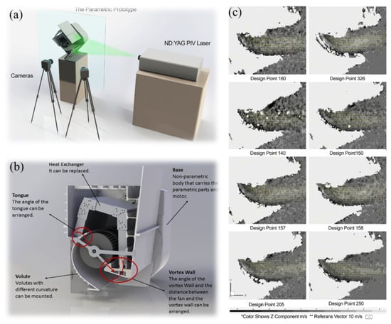 Ozer and Kumlutas [44] conducted a study to examine the flow effects of an embedded Cross-Flow Fan (CFF) within a Split Air Conditioner (SAC). Their research involved a parametric study aimed at evaluating the impact of specific parameters on the defined objective. As illustrated in Figure 5a, the parametric prototype consists of a base and parametric components. For a clearer perspective, the schematic diagram of all the parameters under consideration is presented in Figure 5b, encompassing elements such as volute design, tongue angle, vortex wall angle, and vortex wall distance. To assess the impact of these design parameters on flow structures, the researchers employed Stereo Particle Image Velocimetry (SPIV). Their findings revealed the significance of each parameter. Notably, the vortex wall angle was found to have an approximate 12% effect, while the volute curvature exerted a 32% influence on the flow rate.