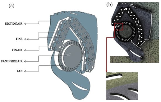 In addition to the various applications of CFFs, other research endeavors have sought to assess the aerodynamic and aeroacoustic characteristics of these fans. Kumlutas et al. [30] delved into both the fluid dynamics and heat transfer aspects of a Split Air Conditioner (SAC) while considering the integration of a CFF within this specific application. They placed particular emphasis on comprehending the intricate flow patterns that manifest within CFFs, and, as a result, they introduced a comprehensive 3D model to analyze the airflow and heat transfer within the SAC unit. To be more precise, they proposed a thin-section model for simulating the indoor unit of the SAC. It is worth noting that this innovative approach serves as a general framework, which is ultimately destined for application in a real-world scenario to verify its validity. Consequently, they conducted experimental tests to validate their proposed model. Furthermore, they sought to validate their model through experimental procedures involving heat transfer measurements and Stereo Particle Image Velocimetry (SPIV). Given that the internal structure of the SAC unit includes the CFF, rear wall, and vortex wall, the airflow within the unit was modeled using a 2D approach, employing nodes for implementing the Finite Volume Method (FVM). The 3D numerical model of the SAC indoor unit, along with mesh details, is presented in Figure 8.