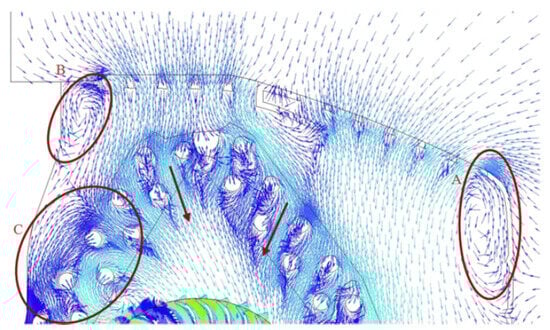 Based on the geometry of the designed CFFs and also the operating conditions, there might be secondary vortices in the inlet and outlet zones. As shown in Figure 11, CFFs consist of a broad cylindrical rotor by which air passage takes place through the blade two times. In fact, the airflow controlled by a large vortex on both the inside and outside of the impeller is a function of the vortex’s size and intensity that is affected by the geometrical parameters of the casing as well as the operation point [55,56].
