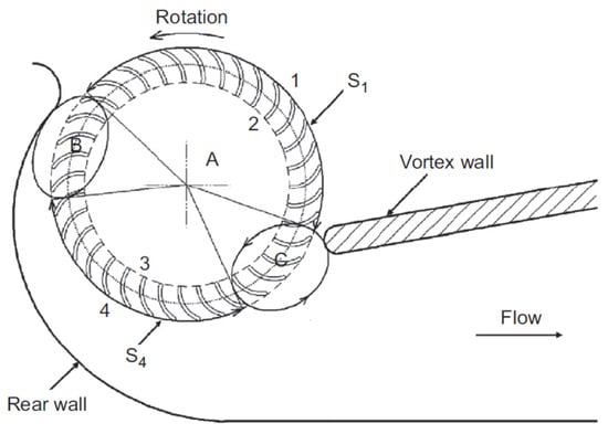There are three flow regions in CFFs, as mentioned previously. These regions are schematically illustrated in Figure 10. Dang and Bushnell [18] have comprehensively discussed these flow regions. They are named A, B, and C. Region A corresponds to the inlet flow and includes most of the air that enters the fan. The flow in region A consists of two stages: flow passage through the suction arc blading and flow passage through the discharge arc. In this zone, the effect of the vortex could be included along with the two stages augmenting the pressure coefficient. Region B refers to the zone that is the important part of the flow passage in CFFs, and its role is not effective on the fan’s performance. Region C is exactly the eccentric vortex. The most important feature of this zone is that there is a re-circulating of flow, and, thus, there might be energy dissipation that affects region A.
