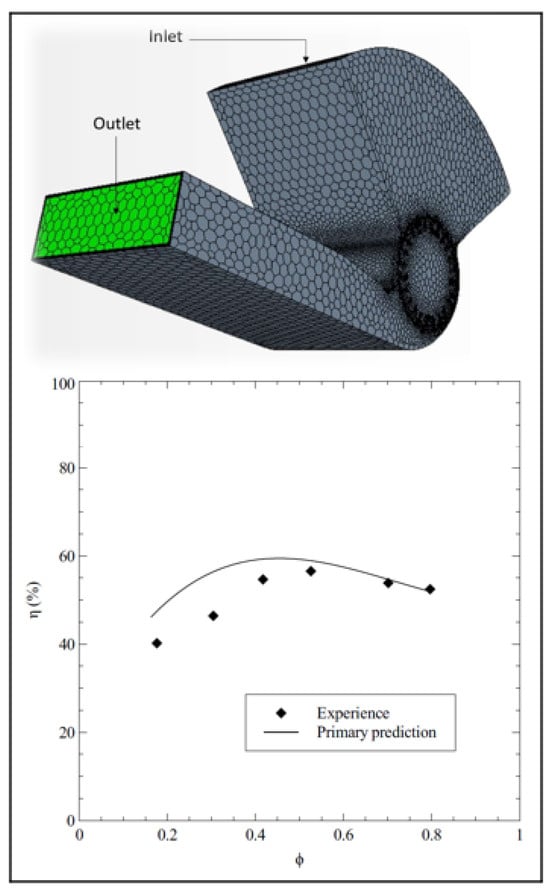 More recently, Himeur et al. [65] have presented a novel methodology in order to predict the performance of the CFFs by focusing on its correlation with the internal field by applying a multidisciplinary approach. Figure 12 indicates the applied CFD meshing as well as the predicted efficiency for the applied CFFs’ geometry. When applying CFD simulation as well as an optimization algorithm combined with the internal flow field, there was good agreement with the experimental data, as reported by the authors.