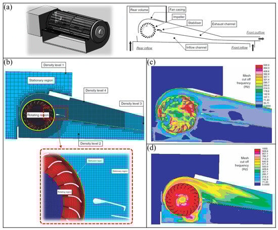 However, from another point of view, it is important to consider mesh generation as it directly affects the quality of performed calculations. So, it is important to perform an interaction through these parameters to optimize the time and cost of calculations by considering an optimized mesh density. Noel et al. [49] performed a multiphysics analysis to calculate sound power level. In fact, they have included an acoustic software code and a CFD code (STAR-CD) in calculating the propagation of the sound power level of a CFF. The cross-section of the duct system, the cross-flow impeller, and the detail of the computational grid are shown in Figure 13a,b. Depending on the possibility of defining the frequency, the mesh density in the fan region was fixed at about 55% of the total fluid cell, as stated by the authors. Figure 13c,d show the frequency range for the first and final computational grids, respectively. Based on their findings, they have observed good agreements between the extracted velocity profile from the PIV test and the CFD model.