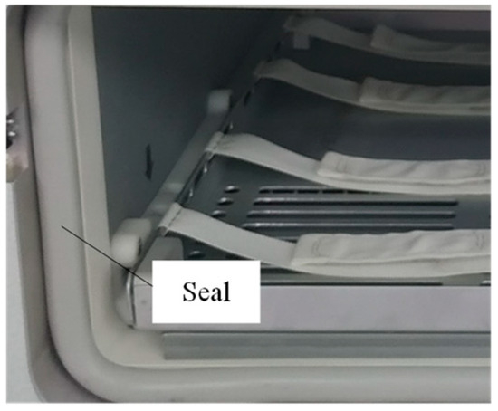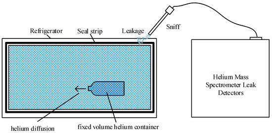 The seal strip with solid silicone rubber and hollow silicone rubber are tested after locking using helium mass spectrometry leak detection (HMSLT). The principle of HMSLT is to put in a certain amount of helium gas and use a helium mass spectrometer to detect helium leaks [20]. Since the space station refrigerator does not have a gas vent for HMSLT testing, a cumulative helium leakage detection method (CHMSLT) was developed for the refrigerator leakage testing in this paper.