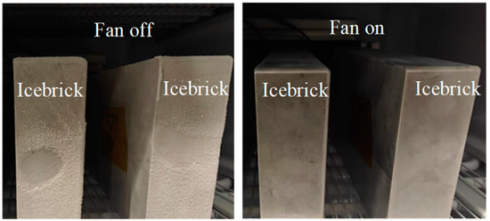 Air cooling is a great method with which to prevent frost formation on the ground. Two groups of ice bricks were compared in a refrigerator in fan-on and fan-off modes. As the hollow sealing strip has superior thermal insulation and sealing performance, there is no frosting at the sealing position, while, in the sample position (ice brick), there is a clear difference in the thickness of the frost. The results show that there is much less frost on the ice brick in the fan-on mode than in the fan-off mode, which could be seen in Figure 7. It indicated that air cooling is an effective method with which to reduce frost in the sample position. It could be concluded that the internal airflow was driven by a fan to frost at the coldest surface, thus avoiding frost at the sample location and seal location.