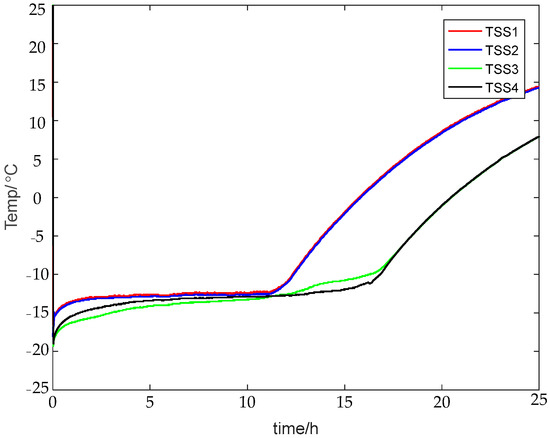 To further investigate the impact of sealing on heat leakage in the refrigerator, an ice brick was used for a cooling capacity maintenance test. The sealed ice brick has a melting point of around −15 °C to −13 °C. During the test, the power of the refrigerator was switched off. TSS1 and TSS2 are located on the ice brick in a refrigerator using solid silicone rubber sealing, while TSS3 and TSS4 are located on the ice brick in a refrigerator using hollow silicone rubber sealing.