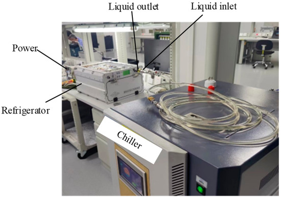 In the long-term testing, a 100 V DC power were supplied to provide power to this refrigerator. A model Lanhaishenjun-2500D water chiller was used as the cooling source. The chiller drove a water and ethylene glycol solution into the cold plate of the refrigerator for heat dissipation. The refrigerator product described in this article uses a thermoelectric cooler as the cooling components. The cold side of the thermoelectric cooler was closely attached to the inner wall surface of the refrigerator storage. A cold plate was installed on the hot side of the thermoelectric cooler to carry away the heat generated by the thermoelectric cooler through the water and ethylene glycol solution.