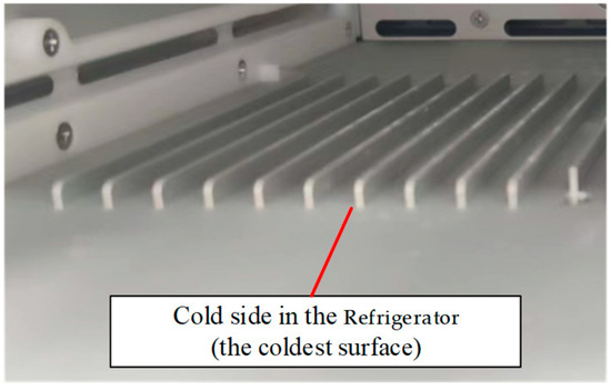 The size of all devices is greatly constrained in space station, making it difficult to use the commonly used cross-flow fans. Therefore, a micro fan and micro flow channel structure were designed in our refrigerator, as shown in Figure 8. This design ensures airflow inside the refrigerator even in a microgravity environment, allowing for a more even temperature distribution on the surfaces. Due to the circulation of air, the location of the frost is more evenly distributed, reducing the thickness of the frost layer in the coldest areas. Additionally, the presence of airflow enhances the internal heat conduction of the refrigerator, minimizing the impact of frost on the performance of the refrigerator.