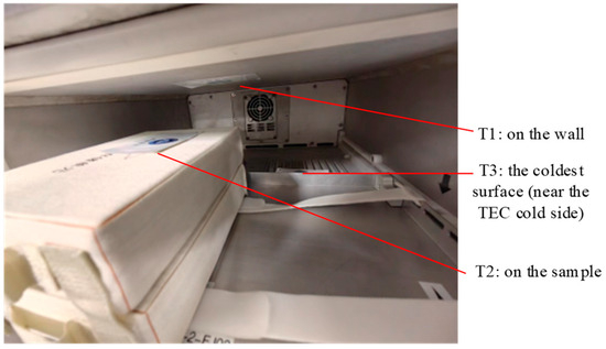 When the refrigerator door was opened, the water vapor would be brought in and would cause a significant amount of frost [16]. If the refrigerator temperature is low, the frost layer will be directly generated on the walls and samples. Therefore, opening the door should be avoided for a long time to reduce the entry of water vapor.