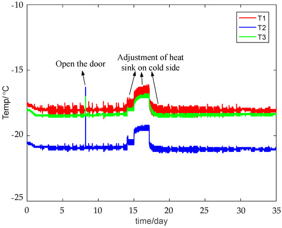 The internal temperature of the refrigerator is shown in Figure 16 and Figure 17. Flow adjustment and door opening operations were performed during this period. T1 and T2 in the figure represent the air temperature, and T3 represents the temperature of the coldest surface.