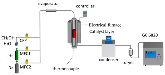 The experimental apparatus mainly includes gas cylinders, an evaporator, a reactor, and gas chromatography (GC), as shown in Figure 2. The reactor consists of a controller, an electric heating furnace, a thermocouple, etc. The flows of production gas and methanol aqueous solution are controlled by gas mass flow controllers (MFCs, uncertainty: ±1.0% F.S, HORIBA METRON) and constant-flow pump (CFP, P220, uncertainty: ±0.3%, Dalian Elite Analytical Instruments Co., Ltd., Dalian, China), respectively. An amount of 5 mL (5.24 g) catalysts were loaded on the catalytic layer, and the catalytic layer temperature was monitored via a K-type thermocouple. Before experiments, catalysts were reduced in situ using 10% H2/N2 of 1000 mL/min at 240 °C for 3 h. The molar ratio of steam to methanol (S/C) was 1.5, methanol LHSV was 1.0/h, and the reaction temperature was at a range of 180–260 °C in these experiments. The reforming gas was analyzed every 10 min until the composition reached stability. The methanol conversion rate and hydrogen yield were calculated according to carbon and hydrogen balance, referring to the previous paper [25].