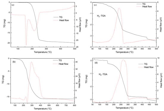 The thermogravimetric characteristic of citric acid was analyzed firstly because the xerogel calcination process would be affected by the excessive citric acid. The TGA curve of citric acid is shown in Figure 3a. Two endothermic peaks appear between 150 °C and 250 °C, indicating that the dehydration reaction occurs first, followed by water evaporation. Above 250 °C, the residual hydrocarbons are gradually oxidized by air. The TG and heat flow curves of the CZA50 precursor (xerogel) are shown in Figure 3b. The heat flow peak around 200 °C represents the heat absorption of free citric acid decomposition. The three exothermic peaks between 200 °C and 450 °C indicate the decomposition of several complexes. The weight loss rate of xerogel reaches 78.8% at 500 °C. As shown in Figure 3c, the H2-TGA curve of CZA50 shows that the sample (28.9 mg) weight loss rate reaches 43% when the heat flow peak center temperature is 237 °C. The mass fraction of metal Cu in CZA50 can be calculated as 48% according to the weight loss (oxygen) at 500 °C, which coincides with the data in Table 1. The weight loss rate of MCZA-0.25 reached 53.8% when the heat flow peak center temperature was 267 °C, as shown in Figure 3d.