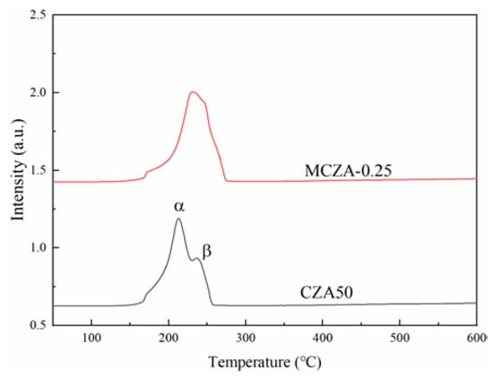 The H2-TPR characterization results of CZA50 and MCZA-0.2 are shown in Figure 4. The H2-TPR carve of CZA50 displays two reduction peaks, where α represents the reduction peak of highly dispersed CuO on the surface, and β represents the reduction peak of bulk CuO [26]. The peak center temperatures are 212 °C and 236 °C, respectively. The H2-TPR carve of MCZA-0.25 exhibits two reduction peaks that overlap, and the peak center temperature is about 230 °C. According to the TGA and H2-TPR results, the initial reduction temperature of CZA50 is lower, which can be attributed to the better CuO dispersion.