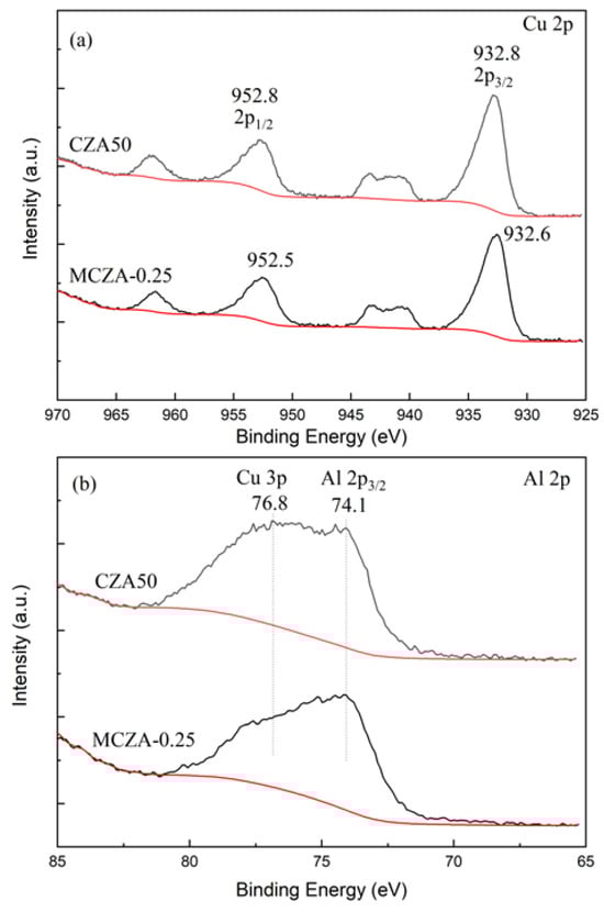 The Cu 2p XPS spectra have four characteristic peaks, as depicted in Figure 5a. The characteristic peak at 952.8 eV can be attributed to the electron binding energy of Cu 2p1/2 level. The characteristic peak at 937.5–946.8 eV is the satellite peak of Cu 2p, and the characteristic peak at 932.8 eV can be attributed to the electron binding energy of Cu 2p3/2 level. As shown in Figure 5b, the binding energy peak at 72.5~76.4 eV in the XPS spectrum belongs to Al 2p3/2. The XPS surface composition analysis results are listed in Table 2. MCZA-0.25 has lower surface Cu and Al content than CZA50, indicating that Cu is embedded in γ-Al2O3 particles and Al is dispersed in ZnO. Additionally, the surface Cu to Zn ratio of CZA50 is closer to 5:3 than that of MCZA-0.25, suggesting a better dispersion.