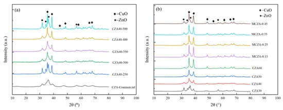 The CuO and ZnO crystal size and specific surface area analysis results are listed in Table 3. The CuO crystal size increases from 14 nm to 17 nm when the calcination temperature increases from 300 °C to 500 °C, indicating that an increase in the calcination temperature promotes crystal growth. For CZA-250, its CuO crystal size is about twice that of other temperatures. Combined with the TGA analysis, it can be concluded that the copper complex decomposed first, while the decomposition rates of zinc and aluminum complexes were low at 250 °C, resulting in a slight aggregation of copper particles. Unless otherwise specified, the catalysts are prepared under conditions of a molar ratio of citric acid to metal ions of 1.5 and calcination at 350 °C for 3 h. The specific surface area increases first and then decreases with the increase in Cu loading and Al/(Cu+Zn); that is, the overall dispersion of the catalyst can be improved by appropriately increasing Cu and Al content. However, the crystal size of CuO increases from 13 nm to 19 nm when the Cu loading increases from 30% to 60%. Both the crystal sizes of CuO and ZnO decrease when the Al/(Cu+Zn) increases from 0.15 to 0.45, indicating that increasing Al/(Cu+Zn) can promote the dispersion of CuO and ZnO. CZA and MCZA catalysts underwent a redox process during the calcination, while CZA-Commercial did not. The fresh CZA-Commercial shows the highest specific surface area. However, the specific surface area of CZA-Commercial decreases to 27 m2/g, and the crystal sizes of CuO increase to 13 nm after redox, as presented in our other paper [25].