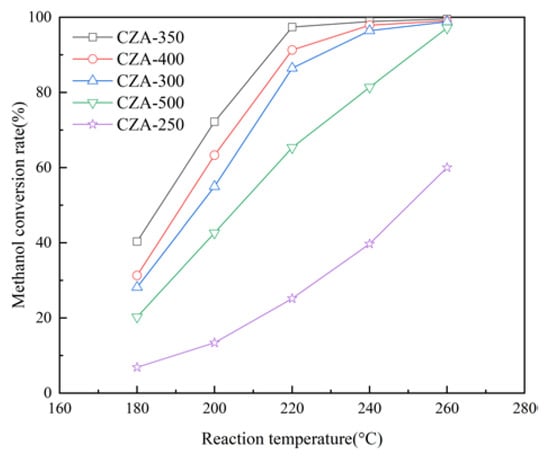 As shown in Figure 7, the methanol conversion rate increases with the increase in reaction temperature because MSR is an endothermic equilibrium-limited reaction. The methanol conversion rate exhibits an initial increase followed by a decrease with increasing the calcination temperature. The CZA-350 catalyst shows the highest methanol conversion rate when the calcination temperature is 350 °C. At the methanol LHSV of 1.0/h and reaction temperature of 220 °C, the methanol conversion rates of CZA-350, CZA-400, CZA-300, CZA-500 and CZA-250 are 97.4%, 91.3%, 86.4%, 65.3%, and 25.2%, respectively. Characterization results indicate that the low activity of CZA-250 can be attributed to incomplete decomposition of complexes. The activity of CZA-500 significantly decreases compared with that of CZA-400 due to the agglomeration and sintering phenomena observed in copper. Therefore, the subsequent catalysts were calcined at 350 °C for 3 h.