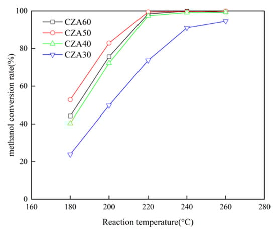 The CZA50 catalyst exhibits the highest MSR activity when the Cu loading is 50% in the conventional sol–gel method, as depicted in Figure 8. The methanol conversion rate significantly improves with an increase in Cu loading from 30% to 50%. However, further increasing the Cu loading to 60% results in a decrease in the methanol conversion rate. The methanol conversion rate can exceed 97.3% at a Cu loading of 40% and reaction temperature from 220 °C to 260 °C. A moderate increase in Cu loading promotes an augmentation of the active substance copper, thereby enhancing the catalytic activity. Nevertheless, an excessive Cu loading leads to a reduction in the specific surface area and the accumulation of CuO particles according to the XRD results, which is consistent with the findings of Yang et al. [27,28].