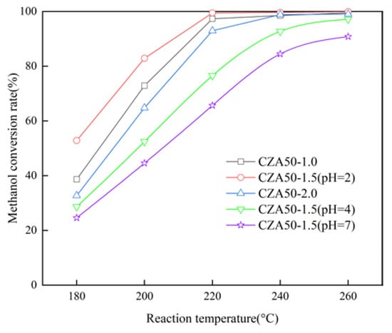Additionally, it is observed that increasing pH leads to a decrease in the methanol conversion rate. The sol–gel solution turned from light blue to dark blue upon the addition of ammonia water due to the easier complexation ability of Cu2+ ions with ammonia compared to carboxylic acid. While a copper–ammonia complex formed rapidly, Zn2+ and Al3+ gradually formed complexes as the solvent evaporated. Gao et al. [30] studied the impact of pH on copper-based catalysts prepared via the sol–gel method and found that CuO particles increased with pH increase, indicating that the addition of ammonia water was unfavorable for Cu dispersity. Similarly, Velinov et al. [31] reported that CuFeMn catalysts without adding ammonia water exhibited smaller crystal sizes and higher catalytic activity than those adding ammonia water. Ammonia makes it easier to form Cu complex than carboxylic acid, which prevents the dispersion of Cu in other metal ions.