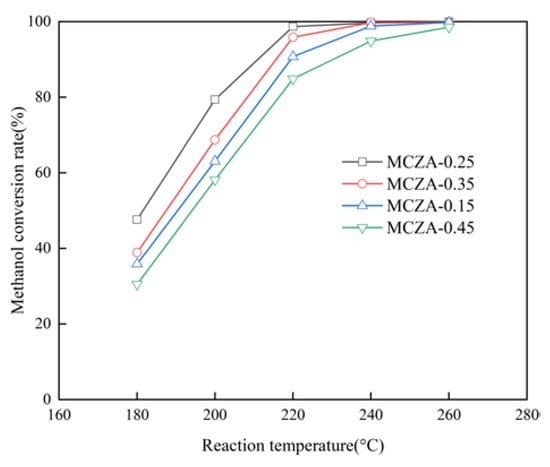 Figure 10 illustrates the effect of Al/(Cu+Zn) on the methanol conversion rate. The optimal mole ratio for Al/(Cu+Zn) is determined as 0.25 based on its superior catalytic performance. It can be observed that the methanol conversion rate follows the following order: MCZA-0.25 > MCZA-0.35 > MCZA-0.15 > MCZA-0.45. At temperature of 220 °C and methanol of 1.0/h, the respective methanol conversion rates of MCZA-0.25, MCZA-0.35, MCZA-0.15, and MCZA-0.45 are 98.7%, 95.9%, 90.8%, and 84.9%. The amount of γ-Al2O3 can regulate Cu dispersion and further affect the catalytic activity according to characterization results of the specific surface area and the crystal size of CuO.
