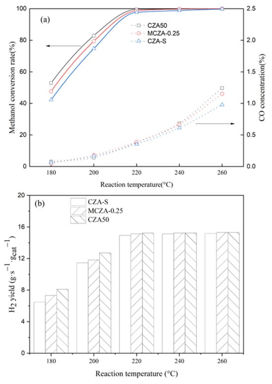 (a) methanol conversion rate and CO concentration; (b) hydrogen yield.